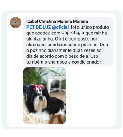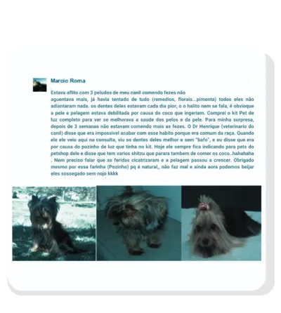 aguentava mais, já havia tentado de tudo (remedios, florais...pimenta) todos eles não adiantaram nada. os dentes deles estavam cada dia pior, o o halito nem se fala, é obvioque a pele e pelagem estava debilitada por causa do coco que ingeriam. Comprei o kit Pet de luz completo para ver se melhorava a saude dos pelos e da pele. Para minha surpresa, depois de 3 semanas não estavam comendo mais as fezes. O Dr Henrique (veterinario do canil) disse que era impossivel acabar com esse habito porque era comum da raça. Quando ele ele veio aqui na consulta, viu os dentes deles melhor e sem “bafo”, e eu disse que era por causa do pozinho de luz que tinha no kit. Hoje ele sempre fica indicando para pets do petshop dele e disse que tem varios shitzu que parara tambem de comer os coco..hahahaha . Nem preciso falar que as feridas cicatrizaram e a pelagem passou a crescer. Obrigado mesmo por essa farinha (Pozinho) pq é natural, não faz mal e ainda aora podemos beijar eles sossegado sem nojo kkkk"